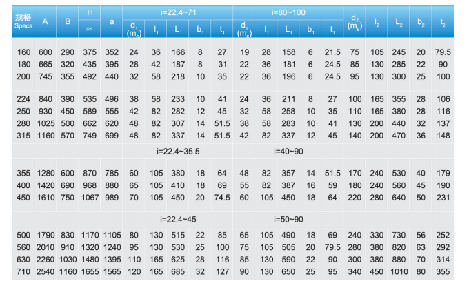 產品型號:ZSY160、ZSY180、ZSY200、ZSY224、ZSY250、ZSY280、ZSY315、ZSY355、ZSY400、ZSY450、ZSY500、ZSY560、ZSY630、ZSY710。公稱傳動比:22.4、25、28、31.5、35.5、40、45、50、56、63、71、80、90、100。